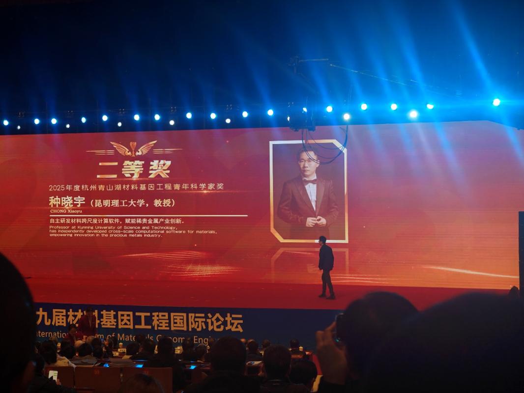 11月20日,第九届材料基因工程国际论坛在陕西宾馆正式开幕。开幕式上隆重颁发了“杭州青山湖材料基因工程青年科学家奖”。本届评选全国仅有12名青年科技工作者入选,我校材料学院种晓宇教授荣列其中,获此殊荣。颁奖环节由中国材料研究学会理事长魏炳波院士,以及大会学术委员会主席张统一院士、李贺军院士、孙军院士共同为获奖者颁发证书与奖杯。