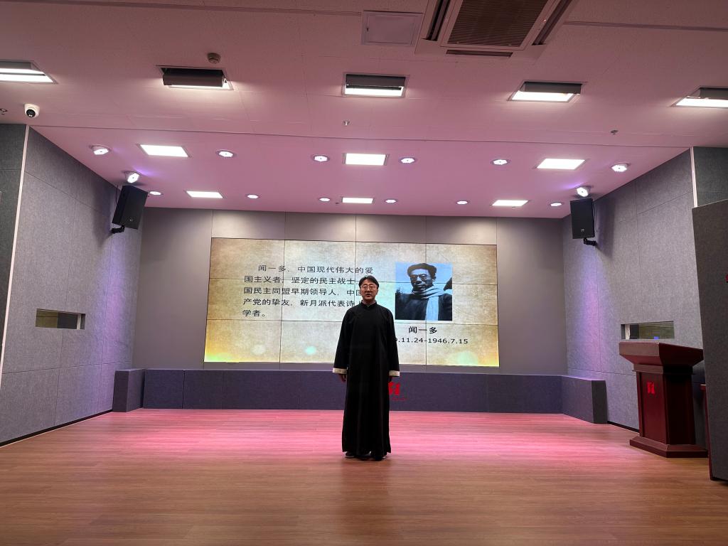 小剧场内,一场精心编排的情景演绎将时光拉回风雨如晦的年代。演员们深情投入,既再现了闻一多先生拍案而起、为民主自由慷慨陈词的铮铮铁骨,也展现了顾维钧先生力护国权、拒签和约,为国家主权与民族尊严坚守公理的爱国风骨。他们用生命诠释的“红烛精神”,用青春与热血铸就“爱国风范”,穿越时空在剧场中激荡,引发阵阵雷鸣般的掌声,更让党员们对“信仰”与“担当”展开深沉思考。