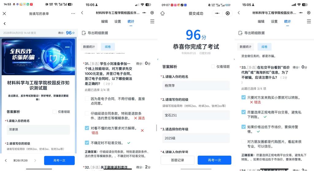 除线下直观授课外,我院辅导员结合高校高发电信诈骗典型案例,精心设计50道反诈案例在线测试题,划定合格分数线,并将测试成绩与日常社区积分挂钩,实现全院本科生100%全覆盖。通过以测促学、以答促记的方式,进一步加深学生印象,帮助其筑牢基础防诈识别与判别能力。