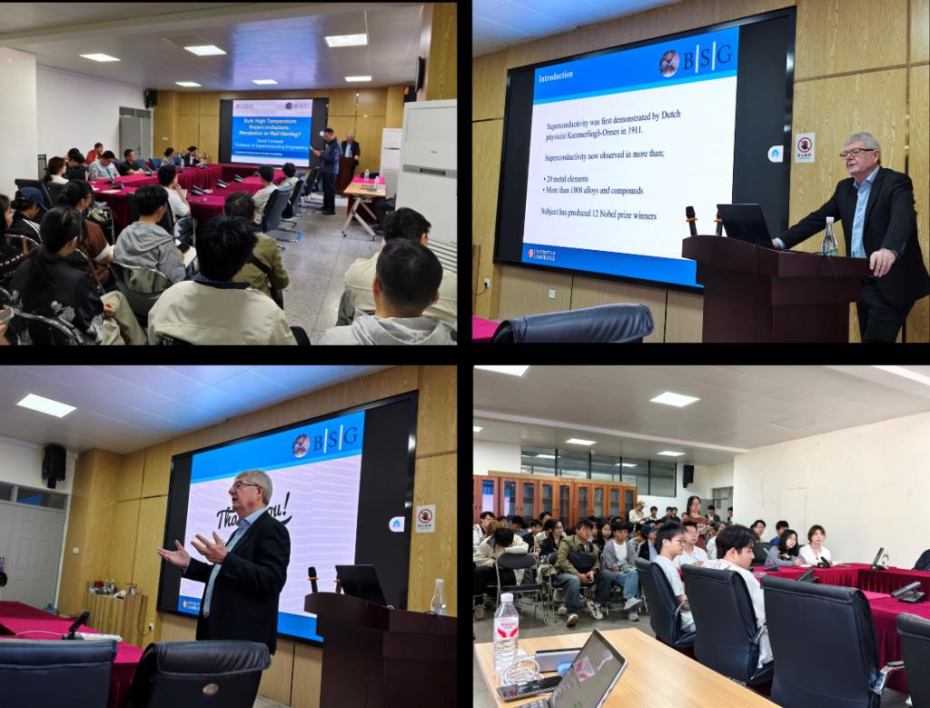 访问期间,Cardwell教授参观了材料学科的发展成果,并重点考察了金属先进凝固成形及装备技术国家地方联合工程实验室,对联合工程实验室的研究进展与技术成果表现出浓厚兴趣,与现场青年教师进行了亲切交流。随后,Cardwell教授在材料楼330报告厅作了题为“块状超导体:革命性突破还是烟雾弹?”的学术报告,报告现场座无虚席。在报告会上,他以生动的科普方式,深入浅出地阐释了高温超导材料的物理原理、独特性质及广阔应用前景,并分享了其研究团队在该领域取得世界领先成果的相关经历。在在提问交流环节,在场师生踊跃发言,就超导技术的原理与应用等话题与Cardwell教授进行了轻松而深入的探讨,现场互动气氛热烈。
