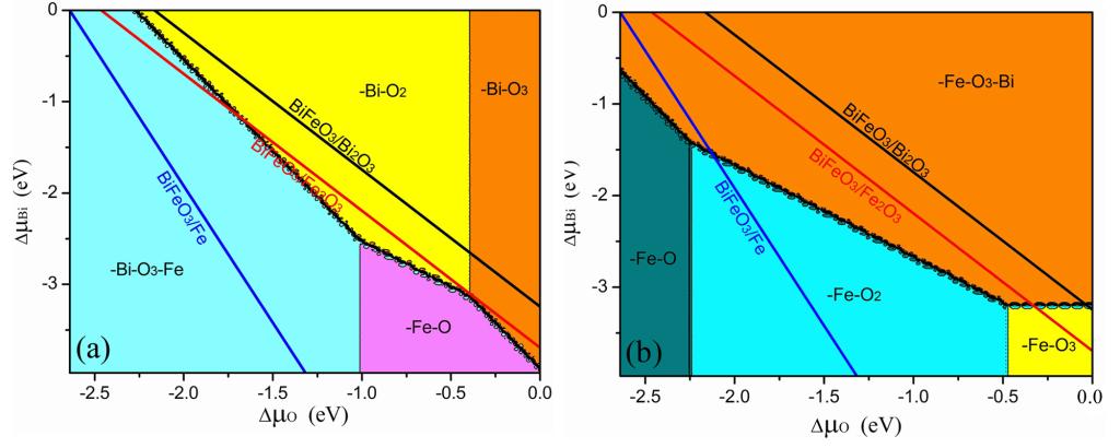 单相多铁性体BiFeO3 (0001) 极性表面的热力学相图(a)负表面(b)正表面